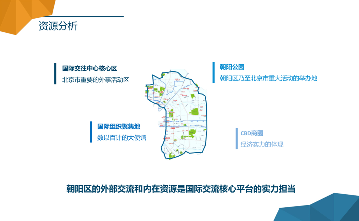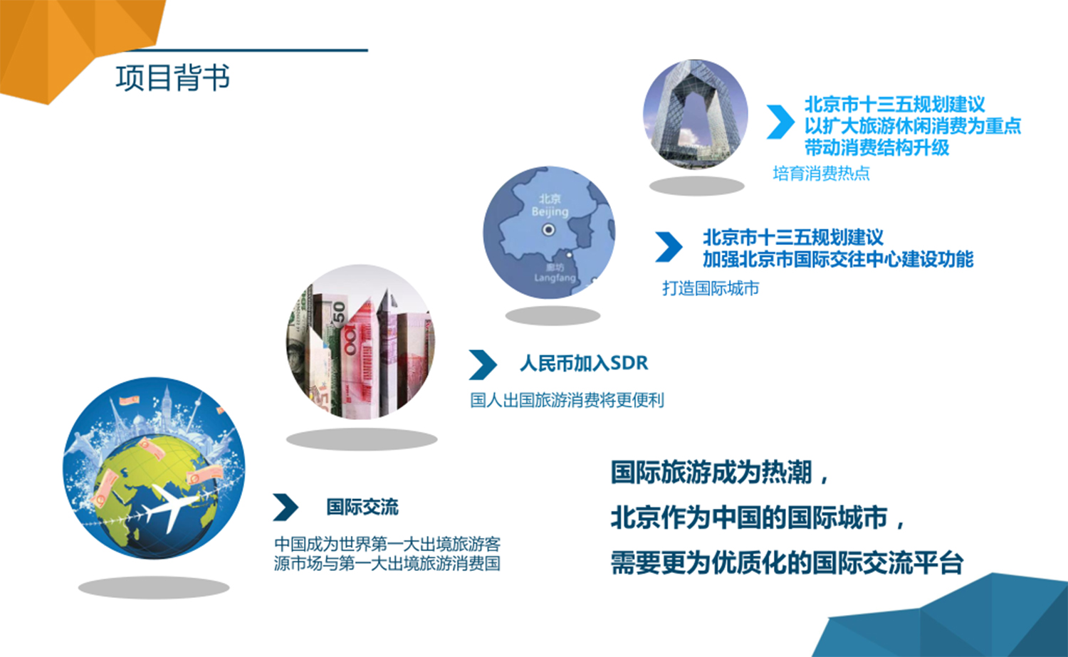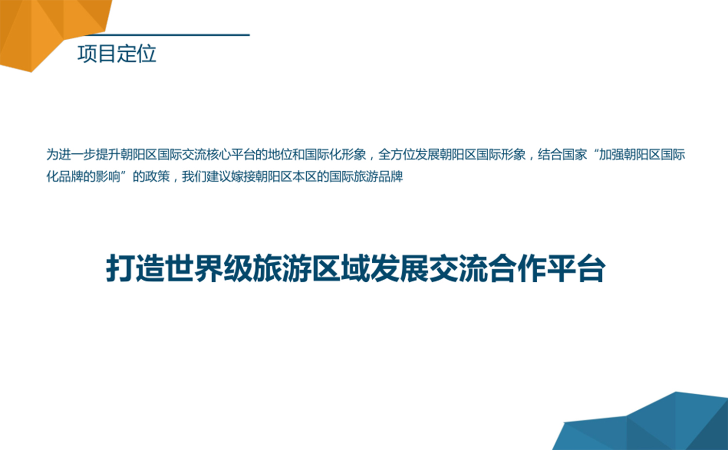 国际旅游成为热潮,北京作为中国的国际城市,国家政策促使北京市朝阳区成为国际交往中心核心区,全方位发展朝阳区国际形象,结合国家“加强朝阳区国际化品牌的影响”的政策,全方位包容的运营模式,助力朝阳区国际化交流平台的全面发展,打造世界级旅游区域发展交流合作平台。